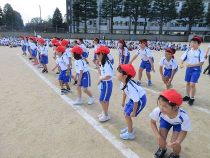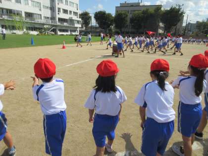 全体練習で、応援合戦の練習をしました。6年生や5年生の姿がとてもかっこよく、憧れの眼差しでした。