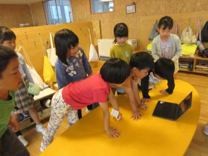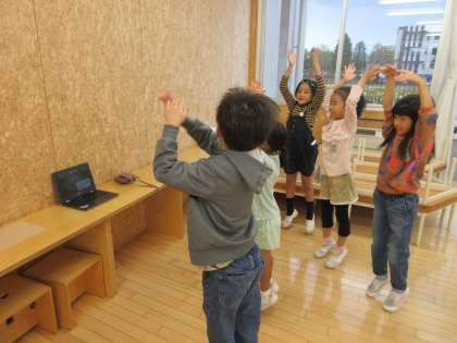 6年生がつくってくれた動画を見ながら、自分たちで練習しています。応援が大好きな様子です。
