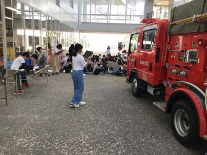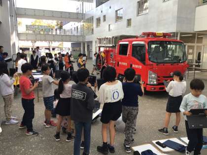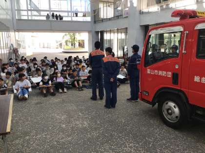 富山市消防団総曲輪分団のポンプ車の車庫の新築に伴い、5年生のポンプ車の絵がシャッターに採用されることになりました。