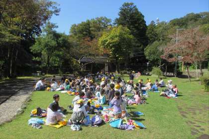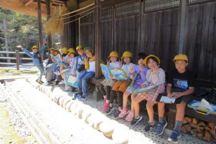 雲一つない快晴の中、民俗民芸村への校外学習に行ってきました。美味しいお弁当を食べて笑顔になったり、古い道具の話を聞いて真剣に学習したりと、様々な子供たちの姿が見られました。