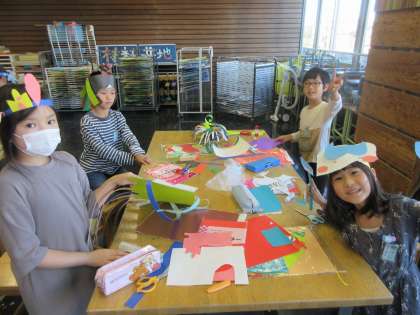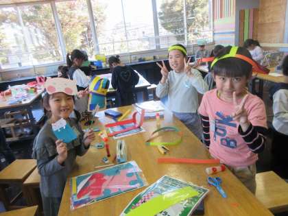 2年生の図画工作科では、画用紙をつかってわっかを作り、その周りに飾りを付けて○○になりきって楽しんでいます。戦士のような鎧を作っている子供もいれば、熊のような動物を表している子供もいました。