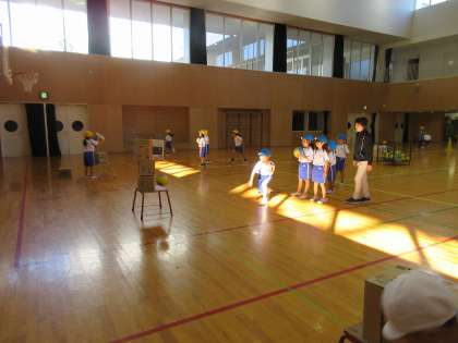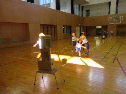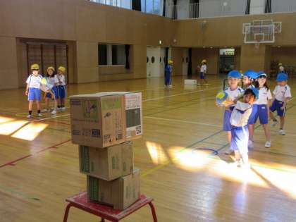 少し離れた台の上に積み重ねられた段ボールを、投げた球の威力でいくつ落とせるかにチャレンジしてみました。「下の段ボールに当てると、たくさん落とせるよ」「足を前後に開いて、勢いをつけるといいよ」等、お互いにアドバイスし合いながら、的当てゲームを楽しみました。