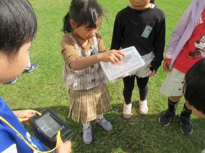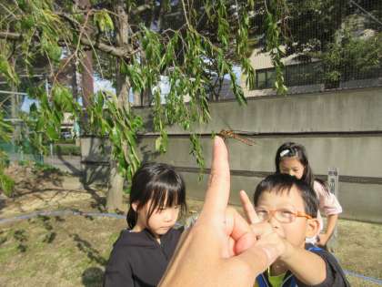 生活科の「いきもの だいすき」の学習では、お気に入りの生き物を見付けるために、校庭に出て、生き物探しをしました。トンボをつかまえ羽や体の様子を観察したり、バッタを虫かごに入れ、図鑑でお世話の仕方を調べたりしながら生き物と触れあっています。自分がつかまえた虫に名前を付けて、お世話する姿がとても微笑ましいです。