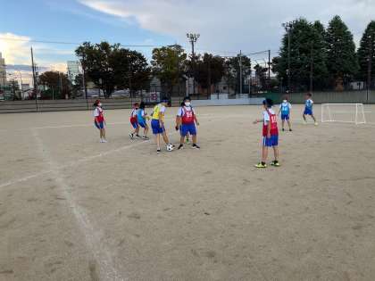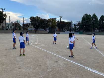 体育科の学習でトライアングルサッカーの学習をしています。円陣パスや、シュート練習の後、練習試合をしました。攻め、守り、司令塔などの役割を意識して練習しています。