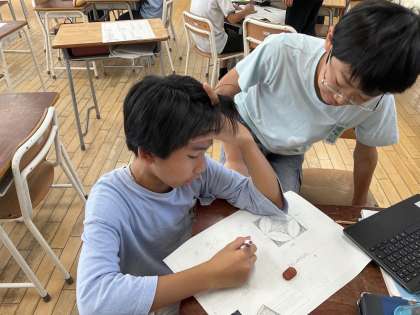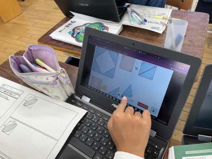 レモン型の面積を求めた後は、一人一人の問いを大切にして発展学習をしました。デジタルコンテンツを使って自分で複合図形を考えたり解いたりしている子もいました。真剣な表情から頭フル回転で考えていることが伝わります。