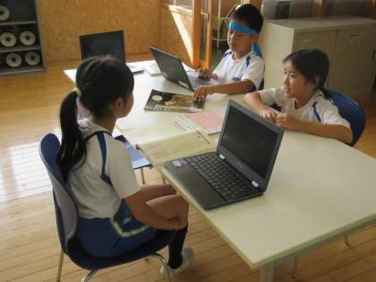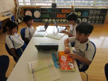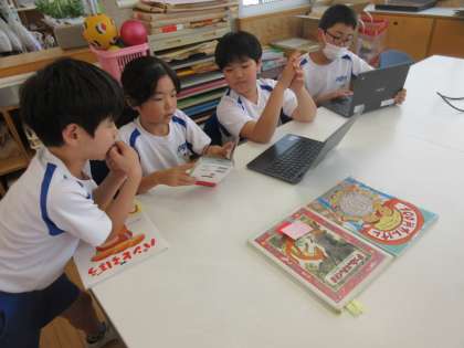 読み聞かせのための、1年生が好きになってくれる本を選ぶ話し合いをしました。司会、計時、記録の役割を確認し、目的に合った話し合いをグループで行いました。