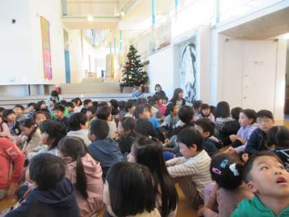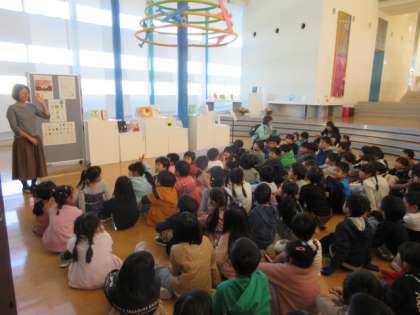 姿勢を正して職員の人の話を聞いています。これからどんなことをするのかワクワク、どきどきしています。