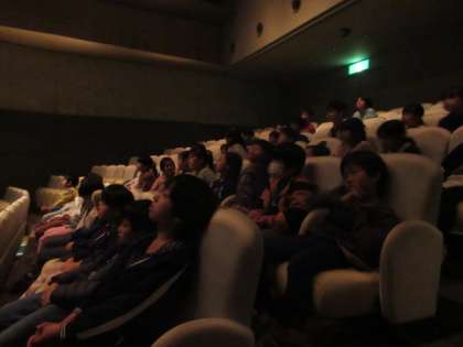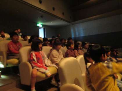 シアタールームで、絵本の挿絵に音声を加えた映画を見ました。おすすめ絵本に夢中でした。