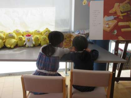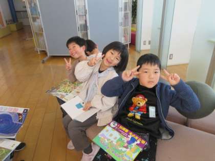 ライブラリーコーナーの様子です。飛び出す絵本、大きな絵本、動いて見える絵本など、めずらしい絵本に興味津々でした。