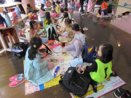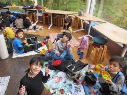 お昼は、こどもみらい館のロビーでとりました。家の人が作ってくださったお弁当を、美味しそうに味わって食べる子供たちでした。