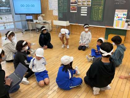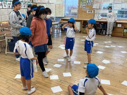 6年生は国語科の学習で話し合い、一年生と楽しく遊ぶ企画を考えました。今日は団ごとに実際に活動をしました。白団と青団の様子です。みんなとても楽しそうです。