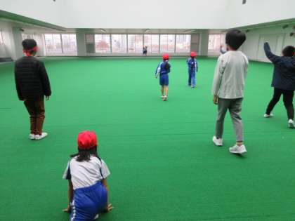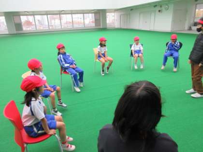 6年1組のお兄さん、お姉さんが、遊びに招待してくれました。1年生は大喜びです。赤団は、「何でもバスケット」や「だるまさんがころんだ」で盛り上がりました。