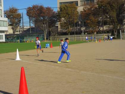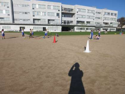 体育科では、「FORチーム みんなかがやくTボール」と題して、テニスラケットを使った易しいTボールをしています。守備の位置や打つ向きなど、チームごとに声をかけ合いながら、活動を楽しんでいます。
