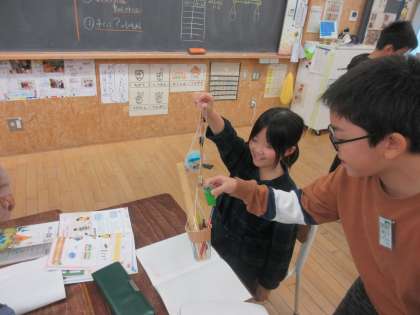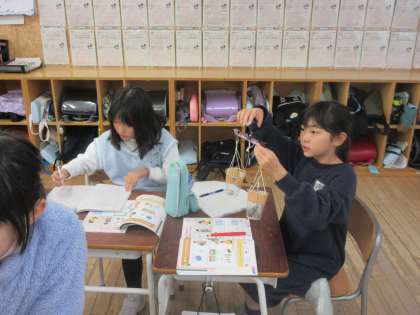 手でもってもどっちが重いか分からない文房具を、はかりを作ってはかってみました。どっちにかたむくかで、重さを比べられることを知り、いろいろなものをはかっていました。