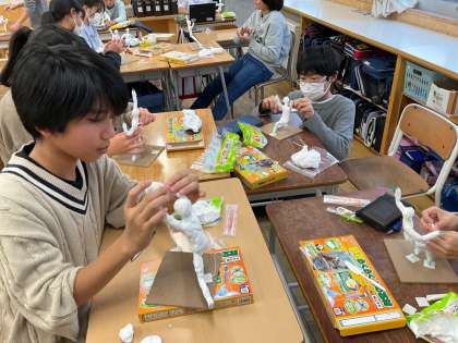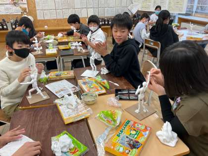 図画工作科で、粘土を使って、未来の自分の姿をつくっています。筋肉や関節、服の作りなどを意識して楽しく作りました。