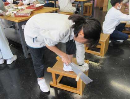 図画工作科では、のこりぎを使って木を切り、動く生き物をつくっています。小学校では、初めてのこりぎを使うので、安全に気を付けながら、慎重に進めています。