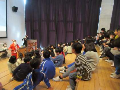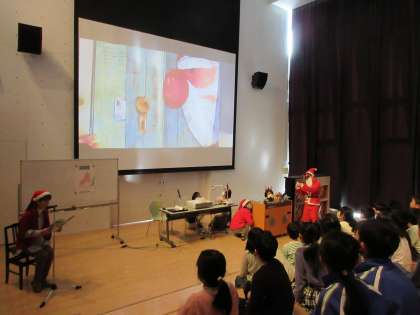 クリスマスにちなんだ絵本の読み聞かせを、図書ボランティアの方がしてくださいました。「おおきいサンタとちいさいサンタ」のお話に夢中な様子です。