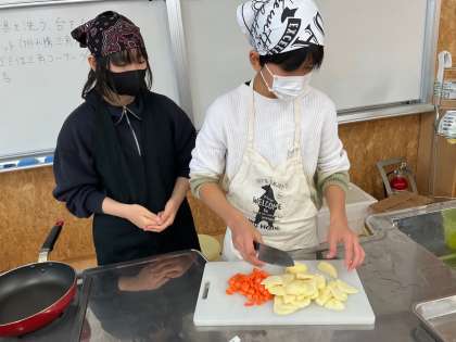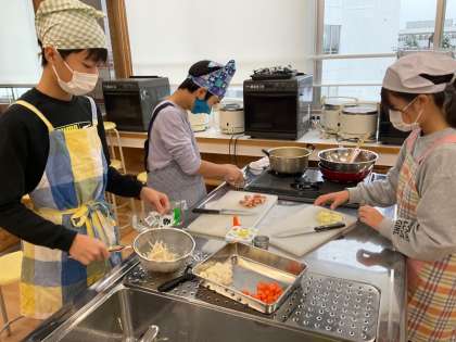 6年生は家庭科の学習で、栄養バランスを考えた献立について学習しました。各班で教科書を参考にしながらおかずを一品考えて、調理実習をしました。まずは、協力して食材を調理しやすい大きさに切りました。包丁も上手に使っています。