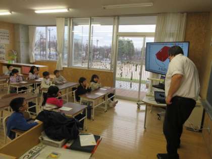 ALTの発音に合わせて、ノリノリで発音を繰り返す子供たち。小学校で初めての外国語活動を楽しんでいました。