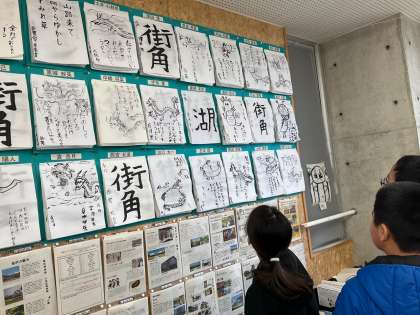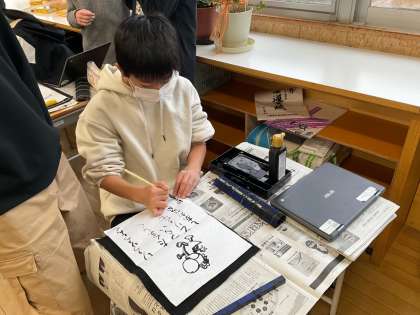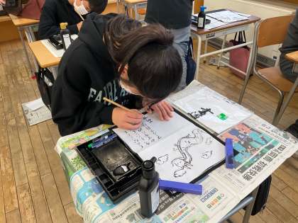 6年生は書写の時間に、小筆を使って辰年のイラストと、新年の目標を描きました。一人一人の個性あふれるカラフルな目当てにみんな気持ちを高めていました。