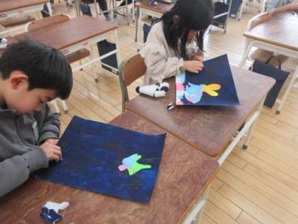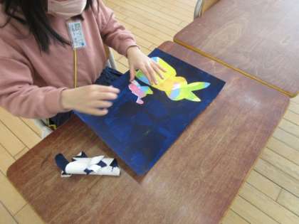 濃紺とピンクや黄緑のカラフルな色が対照的で、とっても素敵な作品に仕上がりました。