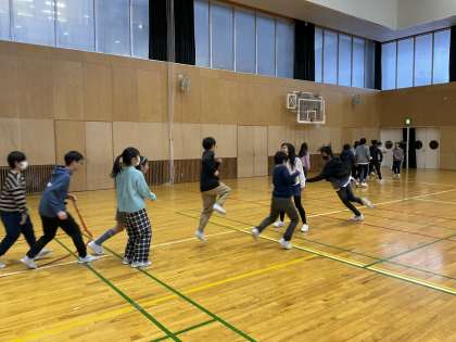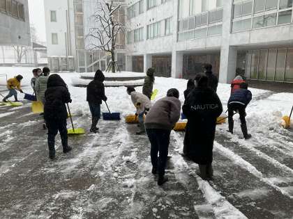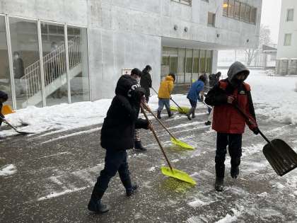 雪が降る日が続いていて、毎日6年生は雪かきを頑張っています。今日は、雪かきで体を温めた後、団ごとに長縄跳びをする「団縄」にチャレンジしました。寒い中でもたくさん体を動かして元気に頑張っています。