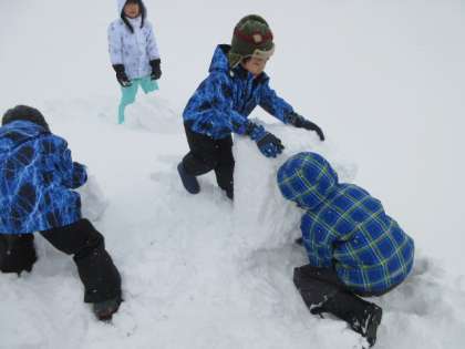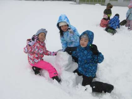 子供たちは、雪が降って大喜びです。今日は、雪遊びをしました。色団対抗「巨大でおしゃれな雪だるま」対決です。