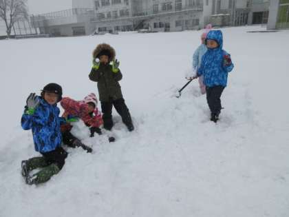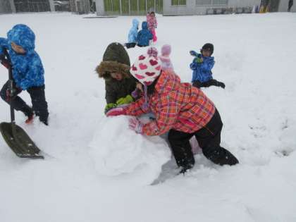 子供たちは、巨大な雪玉を作るために、協力しながら取り組んでいました。