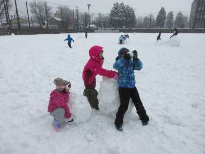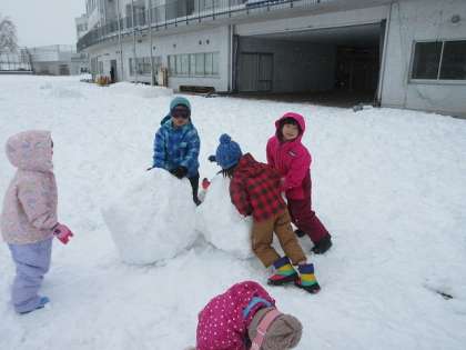 色団に分かれて「大きな雪だるま」選手権大会を行いました。体より大きい雪玉を協力して転がしています。