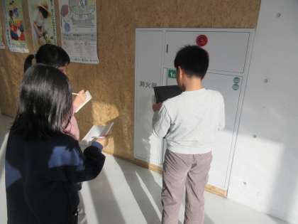 学校の中にある消防施設見つけをしました。消防のための施設が身近にたくさんあることに気付きました。地域や家庭の中でも調査しています。