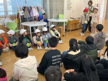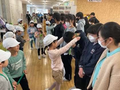 明日の卒業を祝う会に向けて、1年生さんがメダルを届けにきてくれました。同じにじいろ班のペアの子にメダルをかけてもらってみんなうれしそうです。