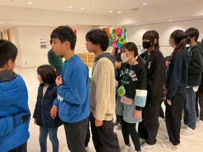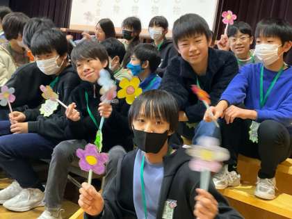1年生が作ってくれたメダルをかけて、手をつないで入場しました。2年からはお花をもらいました。