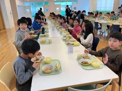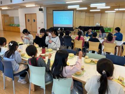6年生は卒業プロジェクトとして、2年生と交流会食をしました。給食を食べながらクイズをしたり、テーマに合わせてトークをしたりしました。和やかな雰囲気で楽しく食べることができました。