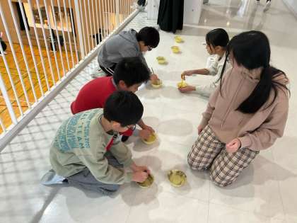 6年生は卒業プロジェクトで3年生とクラブ体験会を行いました。各クラブがお店屋さんのようにブースをつくり、3年生はスタンプカードを持って回ります。