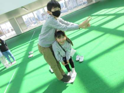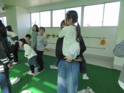 ケイドロのあとは、新聞じゃんけんをしました。負けるたびに新聞が小さくなり、1年生はペアの6年生にくっついたり、おんぶをしてもらったりして、必死にしがみついていました。