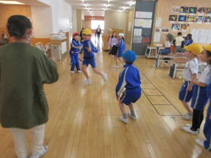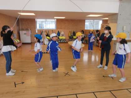 長縄跳びをして遊んでいると5年生がやってきて、長縄跳びの上手な跳び方を教えてくれました。うまく入れたときは、「上手!」と褒めてくれました。