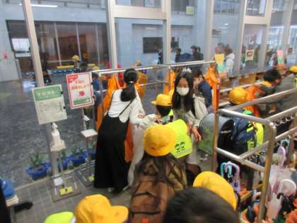 雨の中の登校となった今日、1年生は初めてカッパを着て登校しました。6年生が玄関で出迎え、カッパの着脱や雨具掛けへの移動を優しく補助していました。