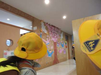 その後、内履きに履き替えた1年生が、壁面掲示を見ながら「あ、鳥が飛んでいる」「どこどこ?」と会話をしていました。丁寧に作られた作品、そこに寄せた素直な感想。心が温かくなります。