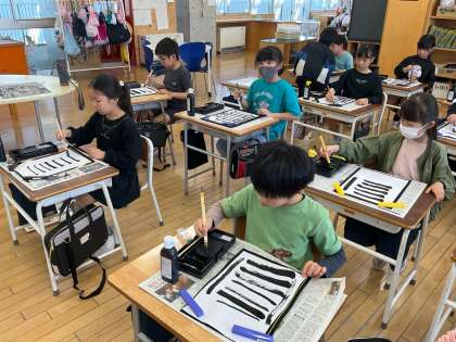 3年生は、初めての毛筆の学習にトライしました。道具の準備、道具の名前、筆の持ち方を確認して、いよいよ書いてみます。トン、スー、トンのリズムと、始筆、終筆を意識して書きました。