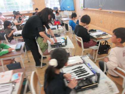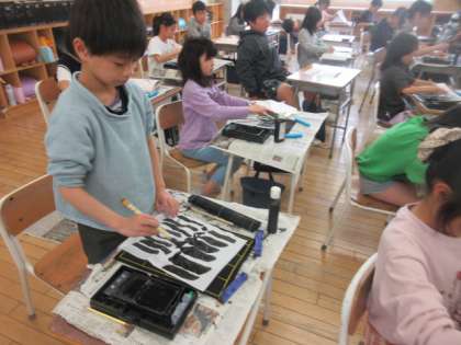 たてや横、折れなどの筆使いの練習をしました。準備や片付けも3年生よりはやくなっています。