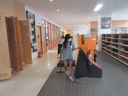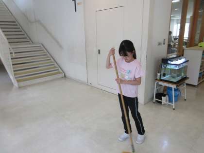 避難訓練の後、グラウンドの砂で汚れた玄関を清掃する6年生の姿が見られました。全校のみんなのために働く6年生です。