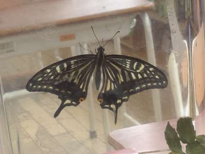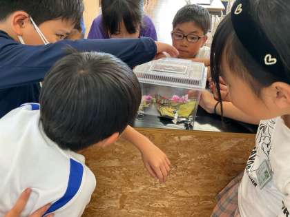 幼虫から大切に育てたアゲハチョウが成虫になりました。はじめは羽もやわらかく弱々しかったチョウの羽がピンとなる様子には心動かされました。みんな感動して、こんなにきれいなチョウは見たことがないとうっとりしていました。観察したあと、みんなでグラウンドで、外に放してあげました。「元気でねー!」とみんなで手をふって見送りました。はじめに捕まえてきて、大切に世話をしていたメンバーは特に誇らし気でした。