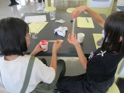 科学クラブでは、今日はスライム作りに挑戦しました。分量を正確に測り、思い思いの色を付けて楽しいスライムが完成しました。