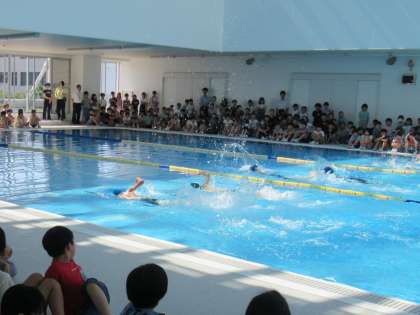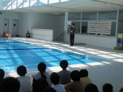 そして児童代表が、クロール、平泳ぎ、背泳ぎ、バタフライのデモンストレーションを見せてくれると、プール室に大きな拍手が響きました。目標をもってがんばるぞ、という気持ちを高めたようです。