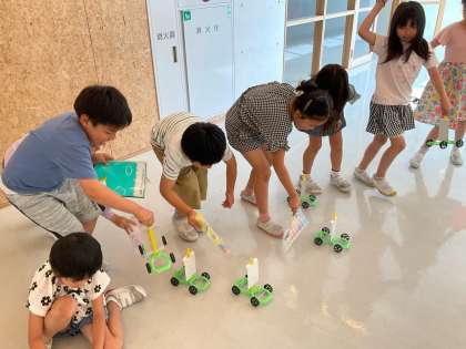 3年生は、理科で風の力とものを動かす力の関係について調べるために、車を作りました。これこら送風機を使って、風が強い時と弱いとこの車の動き方を比べます。みんな実験を楽しみにしていました。