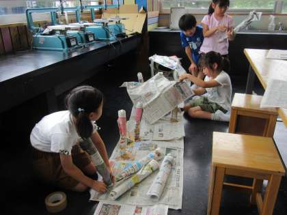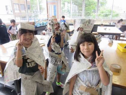 新聞を丸めたり、つないだり、貼り合わせたりして、思い思いの作品を班で協力してつくりました。潜水艦、ヘビ、お城、ベッド等・・・。図工室いっぱいに広がった新聞の世界を思いっきり楽しみました。
