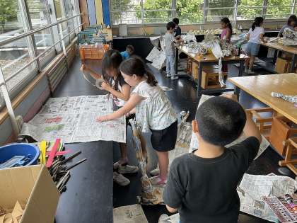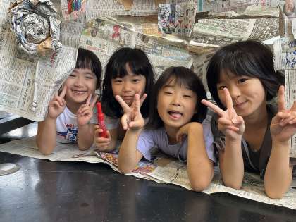 新聞紙でつくったテント、お家、迷路等。完成後は、作品の中で寝転んでみたり、ごっこ遊びをしたりして楽しみました。