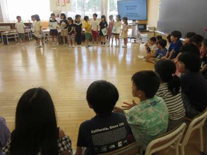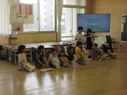 1年3組さんが「大きなかぶ」「おむすびころりん」の音読劇発表会に招待してくれました。元気で愛らしい1年生の音読に自然に笑顔になり聞き入る姿、聞き終わって堂々と感想を伝える姿に、2年生らしい優しさを感じました。