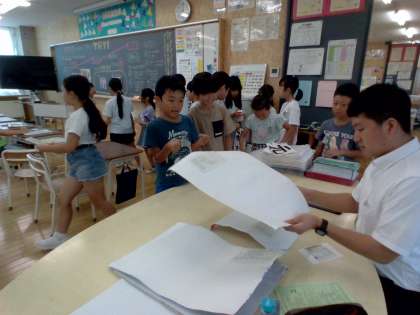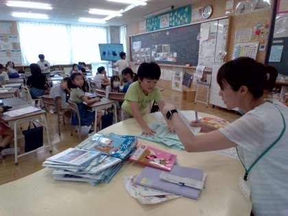 先生に提出しに行きながら、友達と夏休みの宿題や自由研究、課題作品を見せ合っています。「すごいね」「ぼくのはこんなんだよ」と大変にぎやかです。