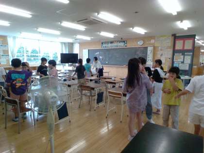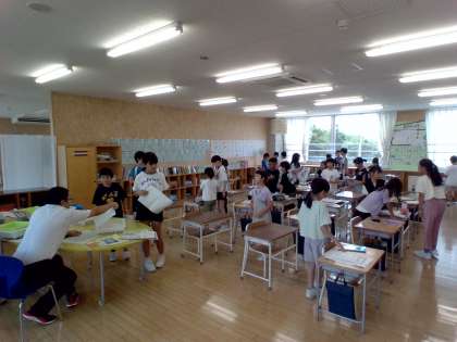 休み中に取り組んだことを友達に紹介したくてたまらない子供たちの姿が見られました。休憩中に、友達と背比べをしている子供たちもいて、ほほえましかったです。